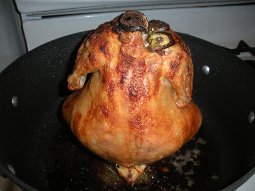 Place the pan in the oven and roast the chicken for an hour and a half. Remove from the oven, and remove the beer can as well once the chicken has cooled. And serve!