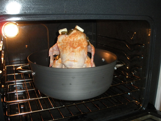 Place the chicken in a roasting pan and rub the rest of the stick of butter on the outside. Rub the remaining spice mix on the outside of the chicken.