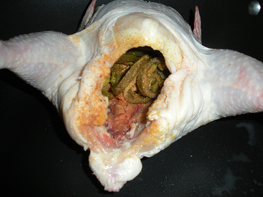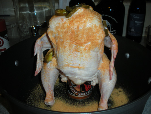 Stuff the chicken with jalapenos, half the stick of butter, and half of the spice mix. Empty out a 1/4 of the beer (preferably in your mouth) and set the stuffed chicken over the can.